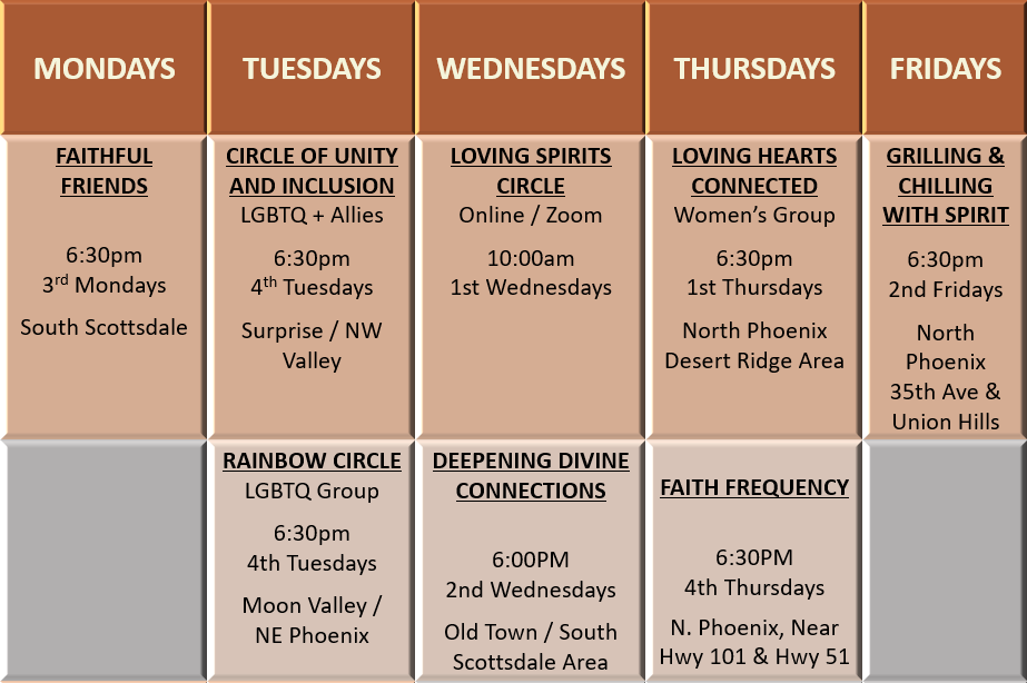 Dedicated co-leaders facilitate each meeting with a theme and stimulating questions for discussion. Those discussion topics reflect the monthly themes and messages we hear from our ministers during Sunday Services.